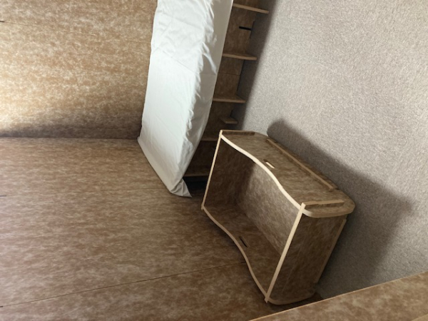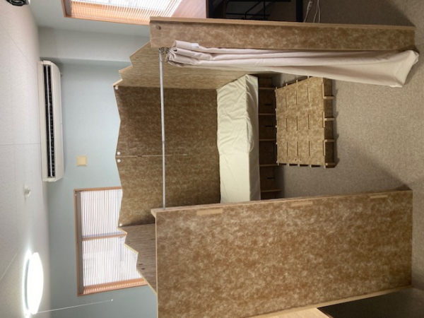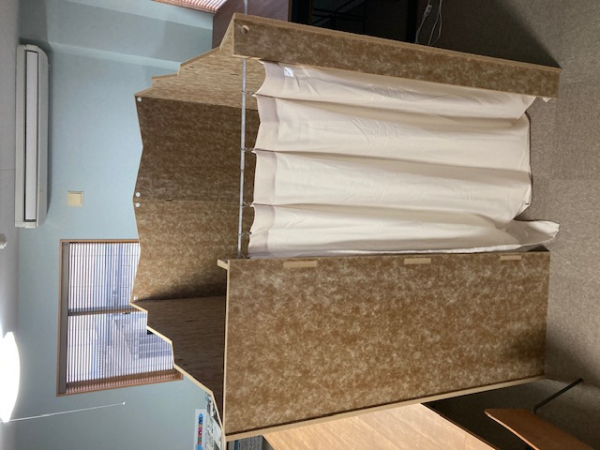 1.5坪のプライベート空間を構成する間仕切りを展示。簡易的救護室、授乳室、着替室等として組立てパフォーマンス実施。組立式簡易ベッド、ベビーベッド、すのこを内部に設置し要支援避難者のQOL向上に資する。 |