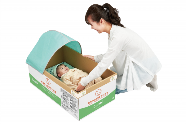 避難所や施設の緊急対策備蓄品として囲まれた空間で、赤ちゃんの安眠を確保。