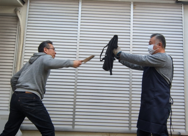 一見オシャレなトートバッグですが、刃物を防ぎます。背面に普段はスーツケースに通すベルトがありますが、いざという時にはそれを持って盾として刃物を防ぎます。また、地震などの際には上から降ってくる可能性があるガラスなどから頭を守る防空頭巾のように使う事も可能です。