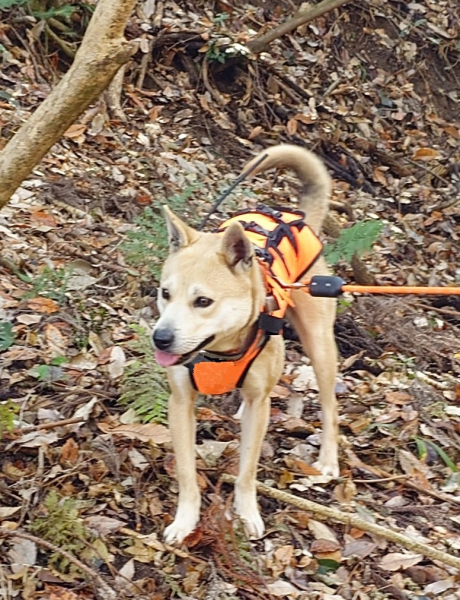 国産の猟犬用防牙ベストです。猪の牙から体を守る為に開発されました。山で目立つ色や、生地のストレッチの方向など細部までこだわった国産品です。