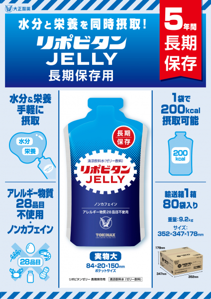 【備蓄用として長期保存できる※リポビタンゼリー】リポビタンゼリー 長期保存用 は、5年間の長期保存が可能なため※、防災備蓄食品として適しています。 ※製造時の賞味期限は67か月となります。