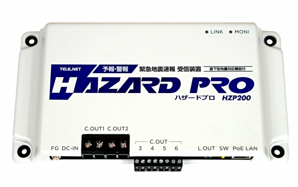 気象庁の緊急地震速報を受信し、予測震度や到達までの猶予時間を音声で通知。地震計内蔵で直下型地震にも対応し、館内放送や設備制御と連動して迅速な避難を支援する装置。