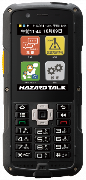 災害時でもつながりやすい法人専用通信帯域を利用した防災通信端末。グループ通話や個別通話、写真・動画・位置情報共有、緊急地震速報受信、安否確認などの機能を備える。