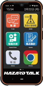 災害用無線機。ワンパッケージであらゆる災害に対応できる機能を搭載。写真・動画システム、気象庁からの緊急配信速報受信。050プライムでの外線通話。それに加えて、ハザードトーク同士なら他社間通信も可能。デュアルSIMでさらなる冗長化。