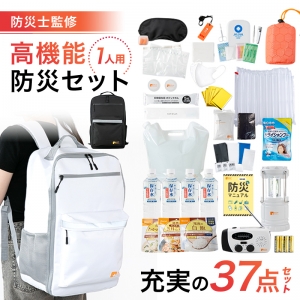 防災士監修の高機能防災セット 充実の37点:保存食や保存水、医療用品、多機能ラジオ、折り畳み式ウォータータンク、非常用簡易トイレなどを便利な小分けポーチで収納する大容量リュックでいざという時の備えを |