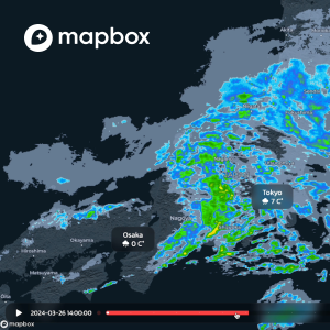 Mapbox Weather Service:Mapbox Weather Serviceは、専門知識や専用のシステムを構築することなく、気象庁からのデータ(キキクルや高解像度降水ナウキャスト)をリアルタイム処理し、高速に地図上に表示、緯度経度での予報データの取得を可能にします