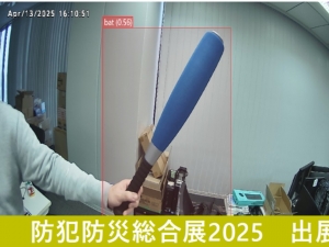 監視カメラ上の特定条件(本展示ではおもちゃのバットを持つ)人を検知すると、モニター上のテロップが変わり、さらにスマホに報知することができます。