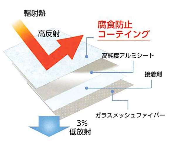 純度99.35%の高純度の両面アルミ素材、厚さ0.23mmの遮熱シートで、暑さの原因である輻射熱を97%反射して建物内への熱の侵入を防ぎます。また、遮熱シートには腐食防止コーティングが施されておりますので、寿命が長く、一度施工していただくと半永久的にノーメンテナンスでご利用いただけます。